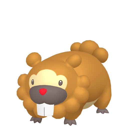 Bidoof is a brown, rodent-like Pokémon with four short legs. It has a short, dark brown snout and a small, red nose. Cream-colored markings cover its underside and surround its face. Round tufts of fur form its tail, with five on the male and three on the female. Similar tufts line the bottom of its face and two singular ones form its ears. Bidoof's black paws have three toes with some webbing between them. Protruding from Bidoof's upper jaw are large incisors, which it uses for gnawing on wood and rocks. These teeth grow constantly, so this Pokémon needs to gnaw on hard substances to keep them ground down. The growth rate of Bidoof's teeth is similar to Rattata.