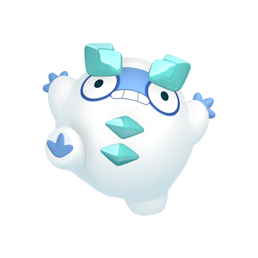 Vanillite is a small Pokémon with a head covered in snow, overall resembling soft-serve vanilla ice cream in a cup or wafer cone. Beneath this lies its actual head, which is made of the same icy material as its body. It has dark blue eyes, a dark-blue mouth, and light blue crystals on its cheeks. Its small body is adorned with specks of ice and has stubby arms. The snow on a Vanillite's head can melt with heat or repeated touching, leaving its head exposed. If seen in this state, Vanillite become embarrassed.