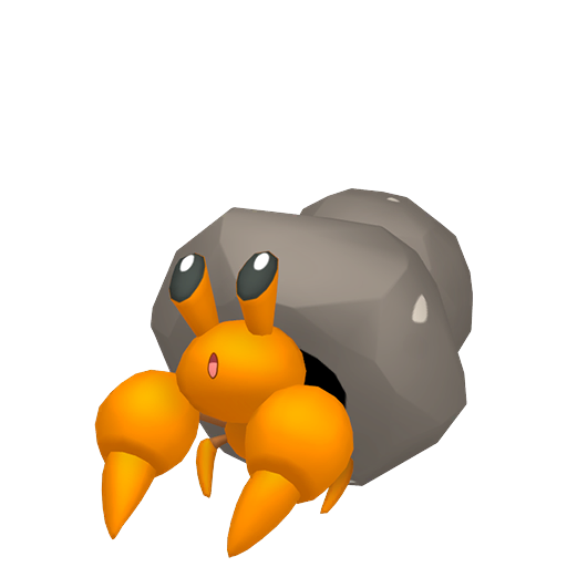 Dwebble is a small, orange, hermit crab-like Pokémon with large pincers. It has dark, oval-shaped eyes supported by eye stalks. It has a hook-like tail that is concealed underneath the sectioned chunk of gray rock it uses as a shell. It ties with Minior and Carbink as the shortest Rock-type.