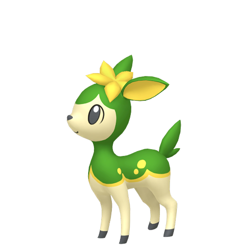 Deerling is a Pokémon that resembles a deer fawn. The upper side of its body is pink in the spring, green in the summer, orange in the autumn, and brown in the winter. Deerling has a yellow-patterned rim, and its underside is peach. It sports a yellow floral tuft on its head with small antlers hidden underneath, and similar yellow coloration on the insides of its tapering ears. The tips of its limbs are colored black and its pink tail is small.