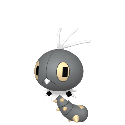 Scatterbug is a black larval Pokémon with a relatively large head. Its head is bisected by a line that runs from the forehead to the mouth. It has large beige eyes with square black pupils, a single pointed tooth that pokes out of its mouth, and three white hairs on top of its head. Scatterbug has a three-segmented body with a pair of nubby, beige legs on each segment. A white ruff of fur encircles its neck, and there is a large beige spot on its rear.