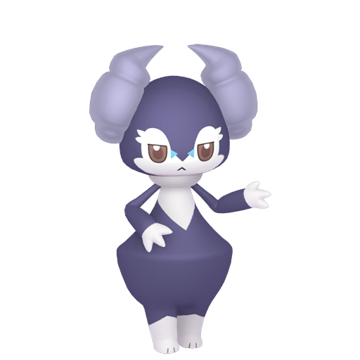Indeedee is a dark purple and white bipedal Pokémon that differs in appearance depending on their gender. Both forms have white faces, rounded heads and pear-shaped bodies, and white hands and feet with three digits on each of them. The males have upward-turned spiral horns, blue markings in-between their eyes, a generally more navy body, and more white around the legs. Females have downward-turned spiral horns, pink markings above their eyes, a white body, and darker legs. These markings all give them the appearance of butlers and maids.