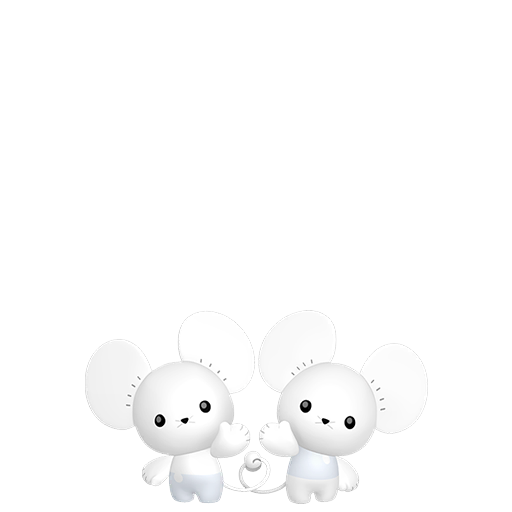 Tandemaus is a Pokémon comprising two separate mouse-like rodent Pokémon which work together as one, much like Exeggcute or Falinks. Each individual is small, white, and bipedal, and has a spherical head with large ears and stubby limbs with large paws. Each one also has two black beady eyes, a tiny black nose with short whiskers, and a long tail which curls up and ends with a bulbous tip. One of the pair has a light-gray patch of fur surrounding its chest which resembles a shirt, while the other has a light-gray patch of fur surrounding its legs, which resembles a pair of pants. When they open their mouths, which take up over half of their faces when fully open, a single upper incisor can be seen on the insides of each one.