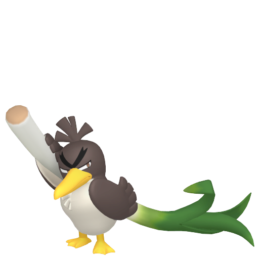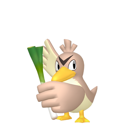 In Galar, Farfetch'd is a deeper shade of brown, with a more prominent black mark on its head and a much more unfriendly look on its face. The leek it carries with its wings is much larger in Galar than the leeks that Farfetch'd use in other regions, although whether it is related to the Large Leek used as a curry ingredient is unknown.