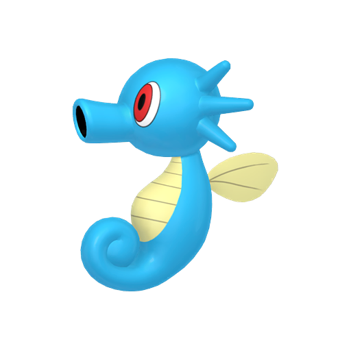Horsea is a light blue, piscine Pokémon that is similar to a seahorse. It has red eyes, a long, tubular mouth, and three spike-like fins on either side of its head. Its ridged belly and single dorsal fin are cream-colored. Highly adept in the water, it uses its dorsal fin to swim in any direction while facing forward. It has a tightly curled tail that it can use as both a balance and an anchor when caught in a strong current. In safer environments, it uses its tail to play with other members of its species.